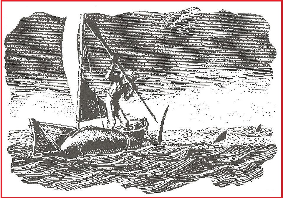 காலையில் படகை ஆட்கள் சுற்றி வேடிக்கை பார்க்கிறார்கள். துறைமுக வாசலில் வெளியே கீழ்த்திசைக் காற்று கடலின் அலைகளை எழுப்பிக்கொண்டிருந்தபோது, ஒரு பெரிய மீனின் வெள்ளை முதுகெலும்பும் முனையில் பெரிய வாலும் கடல்நீரில் ஆடி அசைந்துகொண்டிருப்பதைக் காண்கிறாள், ஒரு உல்லாசப்பயணி. “என்ன அது” எனக் கேட்கிறாள், ஒரு பணியாளரிடம்! நடந்ததை விளக்கிச் சொன்னான் அவன். “சுறாக்களுக்கு இவளவு அழகான வால் உண்டு என எனக்குத் தெரியாது” என்றாள் அவள்.