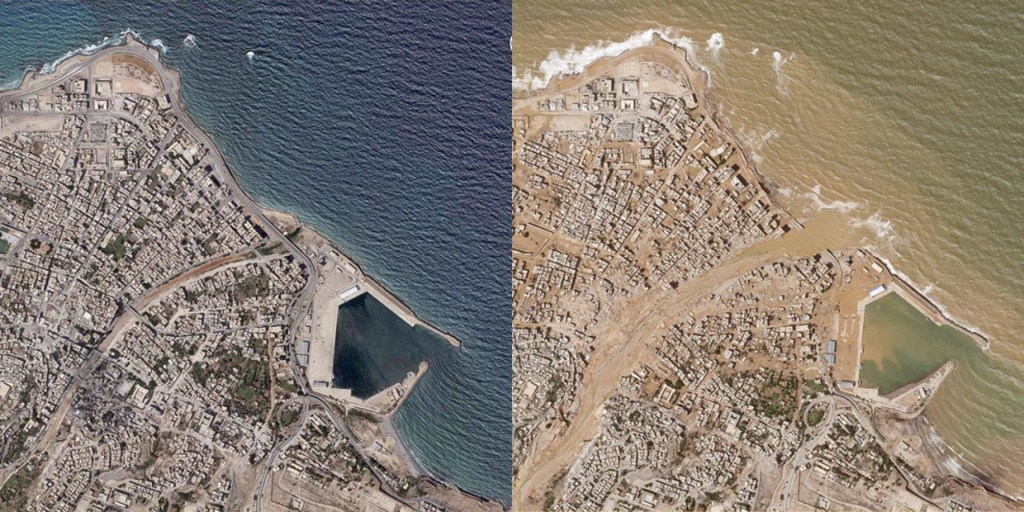 டானியல் என பெயரிடப்பட்ட புயல் மத்தியதரைக் கடலில் (Mediterranean) சற்றித் திரிந்து, லிபியாவை அண்மித்தபோது பெருமழை கவிழ்ந்து கொட்டியிருக்கிறது. ஒன்பது மாதங்களில் பொழியிற மழையின் அளவை ஆறு மணித்தியாலத்தில் கொட்டியிருக்கிறது. இதனால் Wadi Derna என்ற பேராறு அபாய மட்டத்தை அதிவேகத்தில் தாண்டியது. அதன் இரு அணைக்கட்டுகள் தகர்ந்தன. வெள்ளம் நகரை அடித்து வீழ்த்தி, கிடைத்ததையெல்லாம் வாரியள்ளி சிதைவுகளாக கடலுக்குள் கொண்டுபோய்க் கொட்டியிருக்கிறது. ஒரு கால் பகுதி நகரை அது காணாமலாக்கியிருக்கிறது.